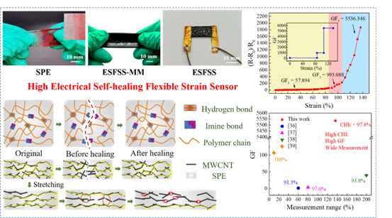 柔性应变传感器广泛应用于可穿戴电子设备、运动健康检测、电子皮肤等领域。这些传感器具有应变范围大、柔韧性强、生物相容性好等优点。然而,柔性应变传感器在使用过程中不可避免地会受到机械损伤,导致传感器性能下降,寿命缩短。因此,在本论文工作中,研究团队提出了一种基于MWCNT-PDMS弹性体的高电学自愈合柔性应变传感器(ESFSS),可实现长期稳定应用。通过对聚二甲基硅氧烷(PDMS)弹性体的分子网络结构设计,引入分子间动态氢键和可逆动态亚胺键,获得自愈合PDMS弹性体(SPE)。并将导电填料多壁碳纳米管(MWCNTs)与制备的自修复PDMS弹性体(SPE)共混,实现柔性应变传感器的电自愈合能力。通过改变SPE的初始材料比,可以调节柔性应变传感器基体材料的自愈效率和力学性能。此外,通过调整SPE中MWCNTs的含量,可以获得具有最佳电自愈能力和机电性能的柔性应变传感器基体材料。本文测试了不同修复条件下ESFSS的电自愈和机械自愈效率,并分析了传感器的电自愈和传感机理。所提出的ESFSS具有较高的电自愈性能,EHE达到97.8%。此外,ESFSS还具有57.894(0-85.36%)、993.088(85.36%-106.64%)和5536.346(106.64%-136.32%)的高GFs和宽测量范围(0-136.32%)。该论文研究的高电学自愈合柔性应变传感器有望应用于人体健康检测与可穿戴电子设备。