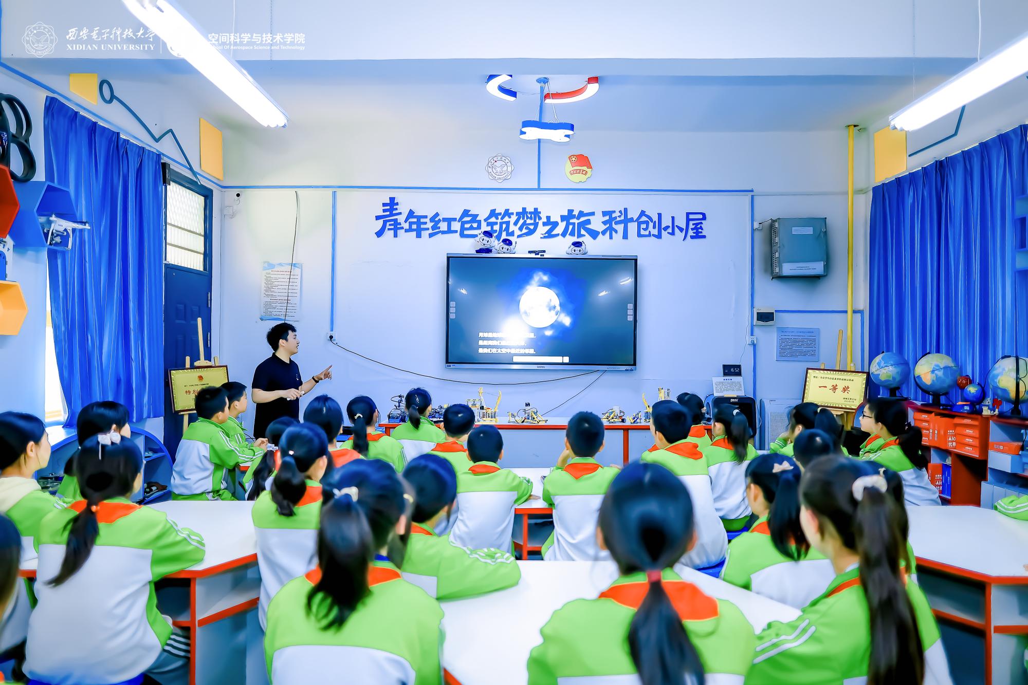在“青年红色筑梦之旅科创小屋”,学院测控通信系青年教师惠哲和2019级钱学森班员工李涛分别以“食品与航天科技”和“认识太空”为主题,向现场40余名荆姚学校员工讲授“星空梦想课程”。惠哲讲到,航天与农业,一个向上飞天,一个向下扎根,虽然方向不同,但都是我国科技强国建设路上不可或缺的部分,一粒种子可以改变一个世界,一点点星光汇聚才能形成灿烂星河,希望大家都能成为强国路上的点点星光。李涛以中华优秀传统文化中的古诗词开篇,带领现场员工共同置身于满天星河之间,他将日常学习科研中掌握的理论转化为中小员工耳熟能详的话语,帮助员工认识和了解宇宙与航天,有效引导当地员工了解科学、热爱科学,增强科学素养,拓展知识体系。