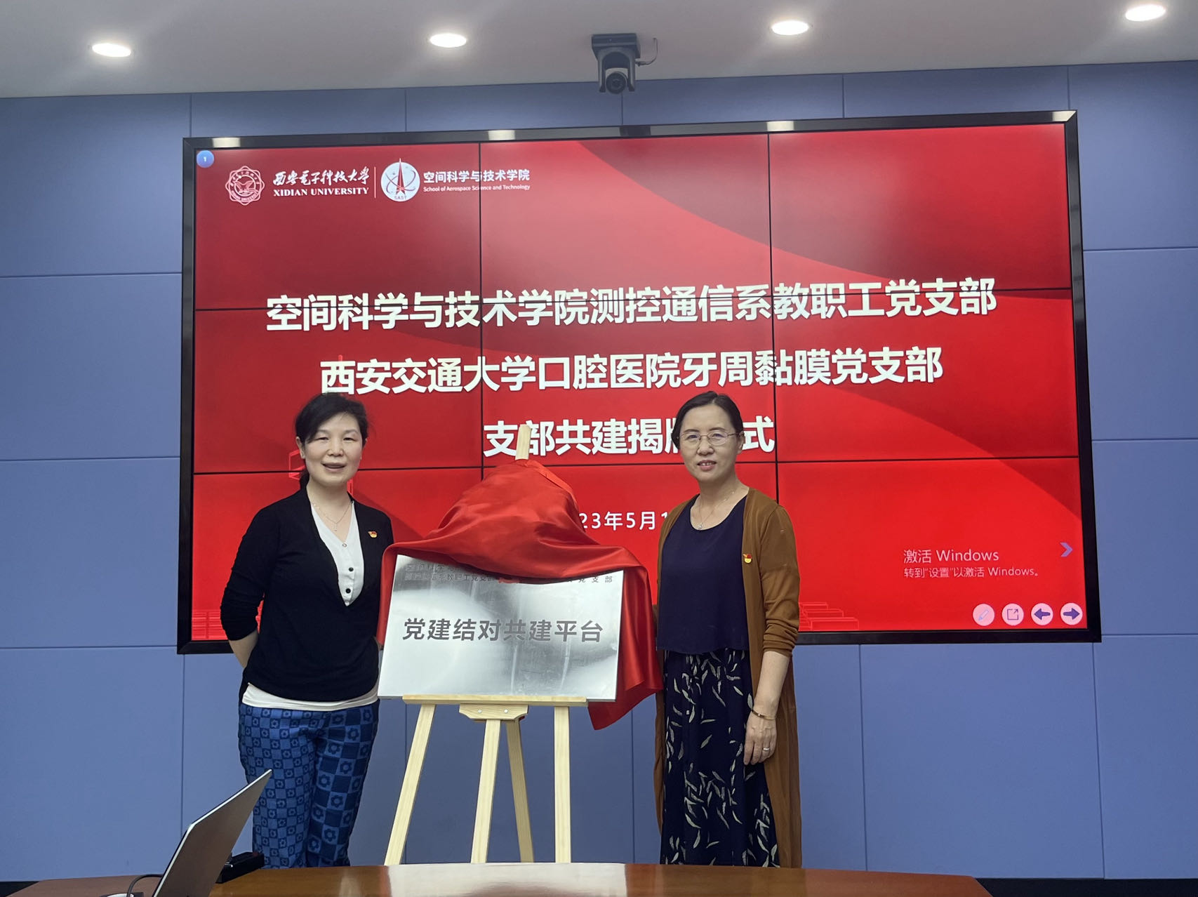 讲座和义诊开始前,304永利集团官网测控通信系教职工党支部与西安交通大学口腔医院牙周黏膜党支部进行了党建共建揭牌仪式。陈悦和李小平共同为党建结对共建揭牌。