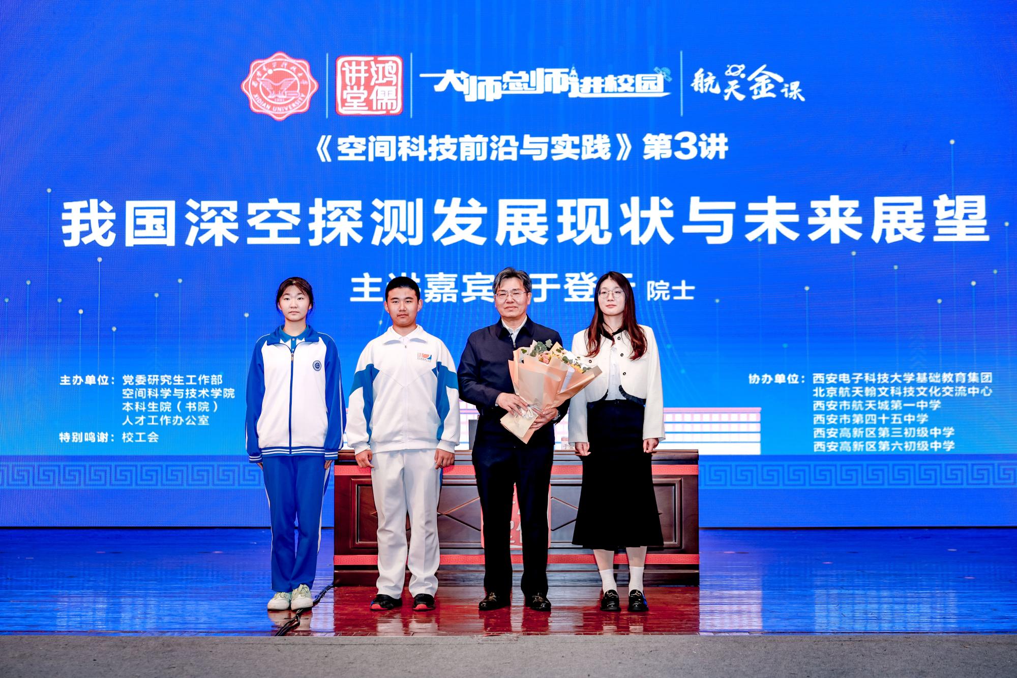 10月17日上午,中国科学院院士、中国航天科技集团科技委副主任、中国探月工程(四期)总设计师于登云以《我国深空探测发展现状与未来展望》为题讲授《空间科技前沿与实践》第三讲课程,中国航天科技集团国际交流中心航天人才教育培训部负责人王娟,北京航天翰文科技文化交流中心副主任韩帅,党委研究生工作部、基础教育集团、304永利集团官网的主要负责同志参加活动。此次课程是中国科协“科普中国”系列活动,也是学校“大师总师进校园”及“鸿儒讲堂”系列活动之一,来自钱学森空间科学实验班、北校区研究生代表、西电附中、西安市航天城第一中学、西安市第四十五中学、西安高新区第三初级中学、西安高新区第六初级中学的师生共计1000余人聆听了这场航天思政金课。报告会由公司党委常委、宣传部部长季庆阳主持。